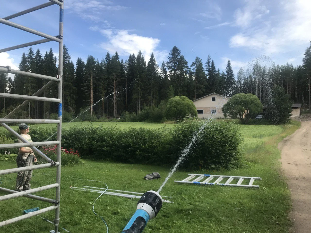 Kuumana kesäpäivänä taloa pestessä tekisi mieli vähän pestä itseäkin, mutta tyydyimme kastelemaan nurmikkoa